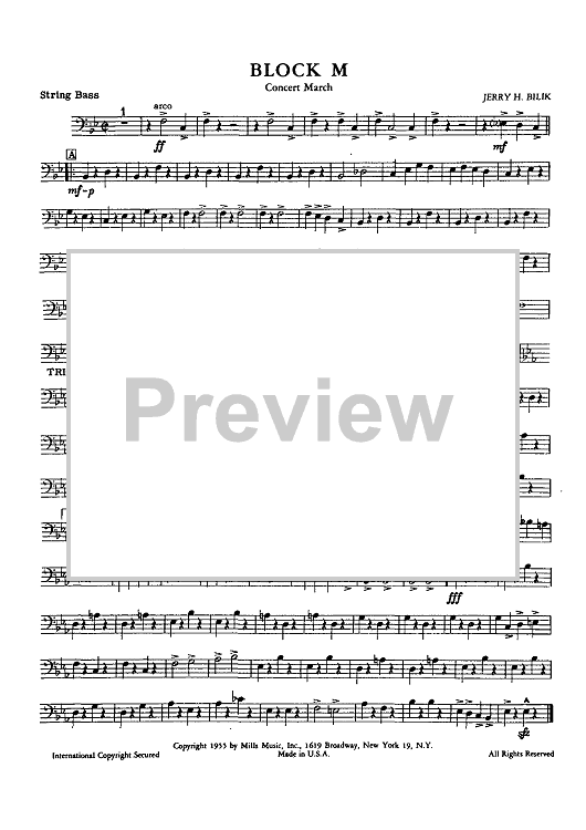 Digital Sheet Music for Block M - Concert March - String Bass by , Jerry H. Bilik scored for Concert Band; id:432999