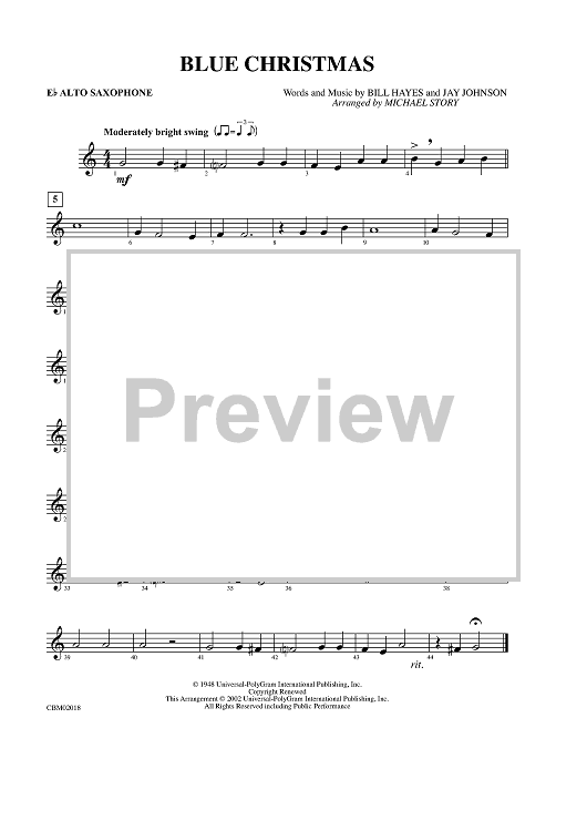 Digital Sheet Music for Blue Christmas - Alto Saxophone by Billy Hayes, Jay Johnson, Michael Story scored for Concert Band; id:314254