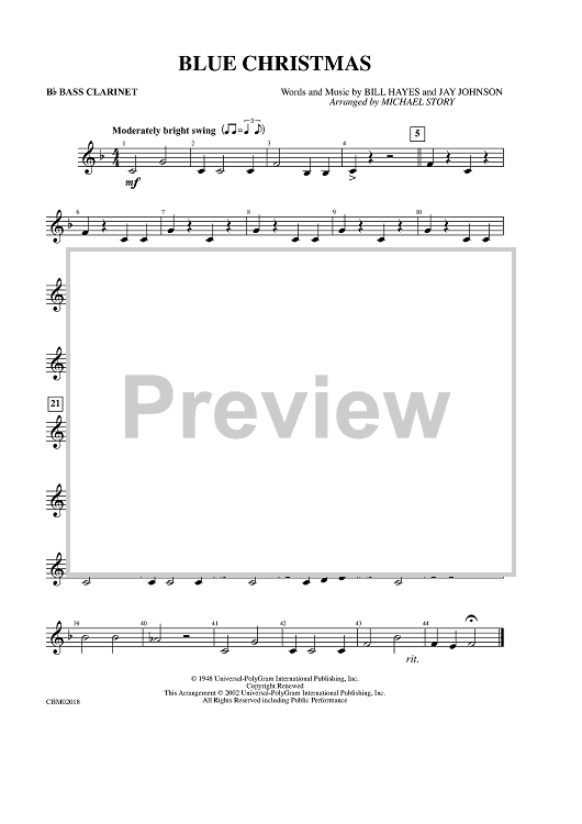 Digital Sheet Music for Blue Christmas - Bass Clarinet by Billy Hayes, Jay Johnson, Michael Story scored for Concert Band; id:314253