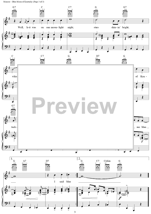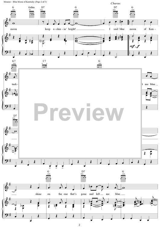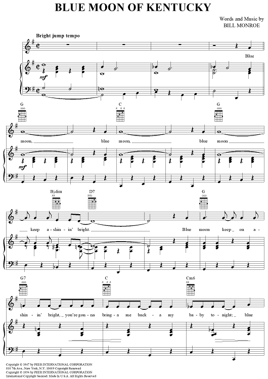Digital Sheet Music for Blue Moon of Kentucky by Elvis Presley, Bill Monroe, Earl Scruggs scored for Piano/Vocal/Chords; id:252299