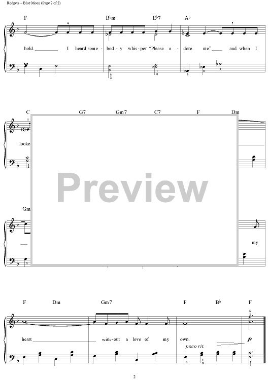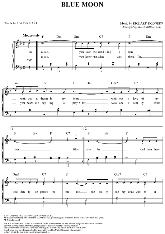 Digital Sheet Music for Blue Moon by Richard Rodgers, Lorenz Hart, John Brimhall scored for Easy Piano/Vocal; id:118959
