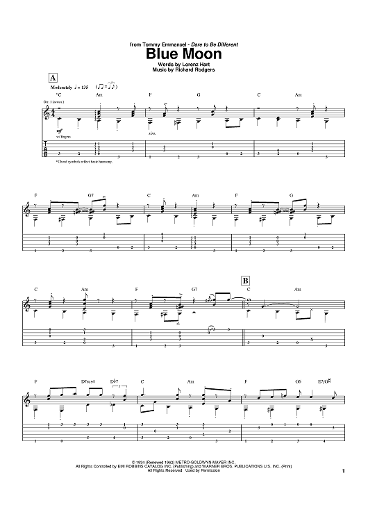 Digital Sheet Music for Blue Moon by Richard Rodgers, Lorenz Hart, Tommy Emmanuel scored for Guitar Tab; id:401065
