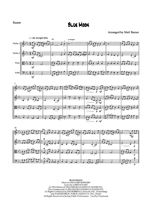 Digital Sheet Music for Blue Moon - Score by Richard Rodgers, Matt Turner scored for String Quartet; id:462896