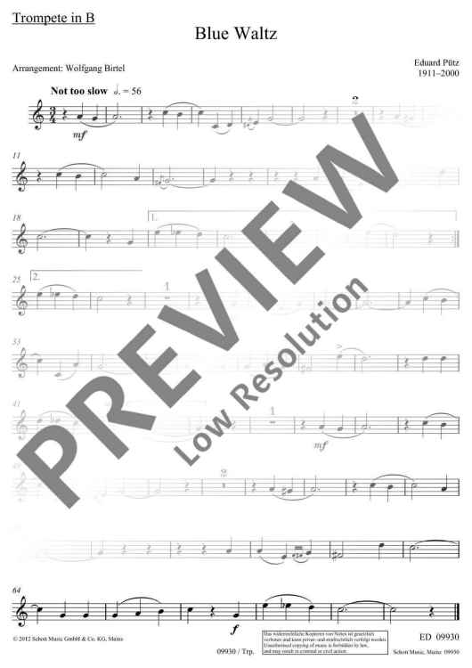 Overcoming the boundaries between 'serious' and entertaining music was what mattered to the musician Eduard Pütz (1911–2000). His compositions therefore include stylistic features of jazz and pop music. Many of his works were written for children and young instrumentalists to offer them a break from the monotony of classical sonatinas and studies. 'Blue Waltz' is such a treat – very easy to play, it carefully helps the player to open a listening ear for jazz sounds. The arrangement for accompanied melodic instrument is also suitable for beginner's lessons and the first ensemble playing.