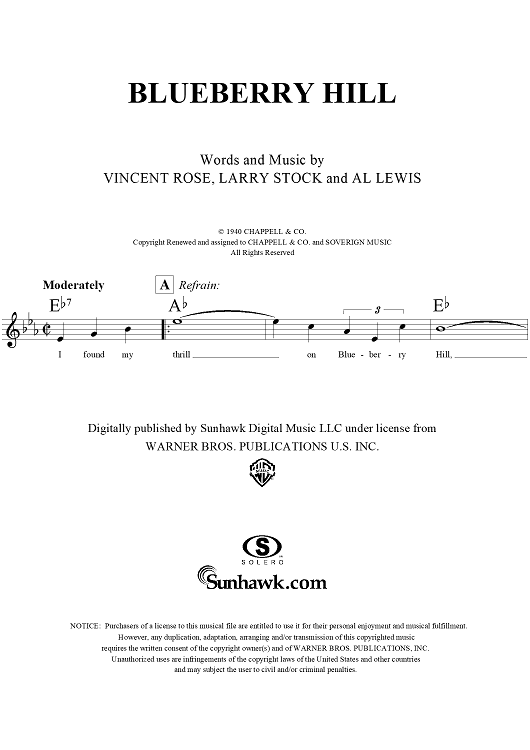 Digital Sheet Music for Blueberry Hill by Vincent Rose, Al Lewis, Larry Stock scored for Lead Sheet; id:290808