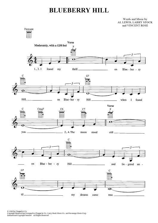 Digital Sheet Music for Blueberry Hill by Vincent Rose, Al Lewis, Larry Stock, Fats Domino scored for Ukulele/Vocal; id:445524