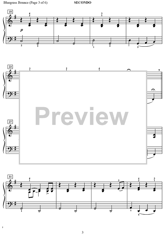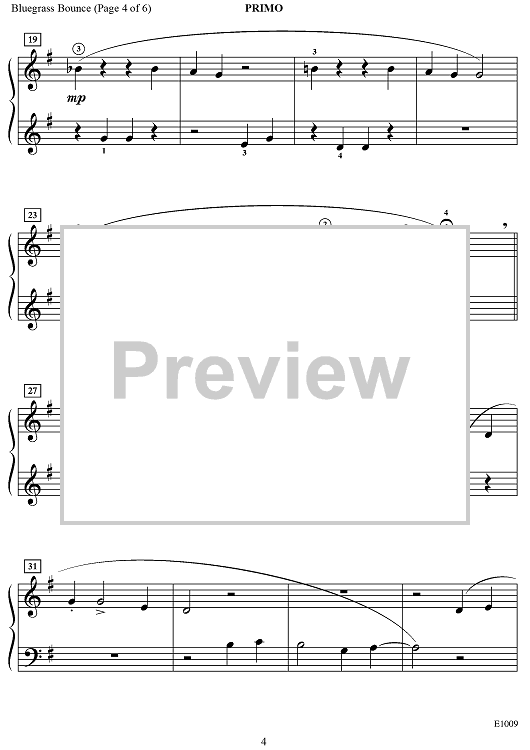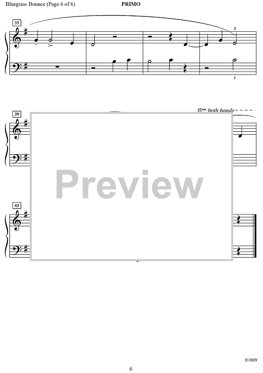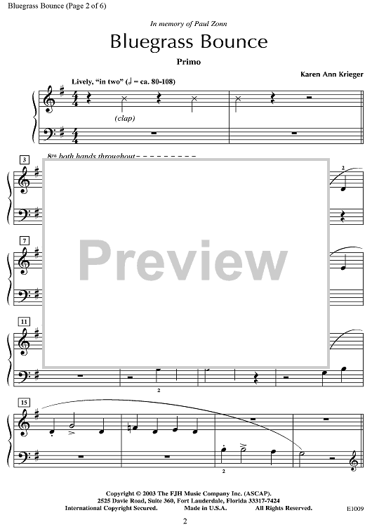 This delightful duet is the perfect choice for ensemble fun. Students will love the bluegrass melody, the clapping, and the moderate syncopation of their primo part, while teachers will enjoy the lively banjo styling of their secondo part. Bluegrass Bounce is sure to turn your next lesson into a jumpin' jamboree.