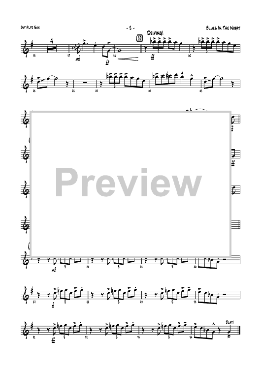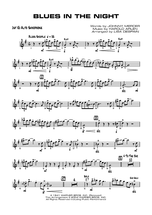 Digital Sheet Music for Blues in the Night - E-flat Alto Saxophone 1 by Harold Arlen, Johnny Mercer, Lisa DeSpain scored for Jazz Ensemble; id:358757
