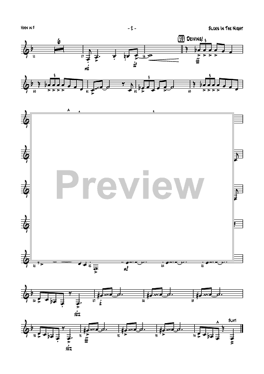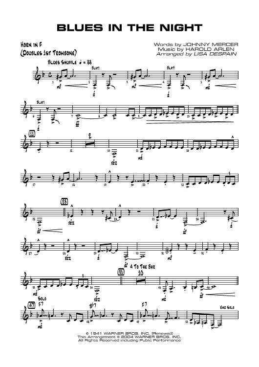 Digital Sheet Music for Blues in the Night - Horn in F by Harold Arlen, Johnny Mercer, Lisa DeSpain scored for Jazz Ensemble; id:358770