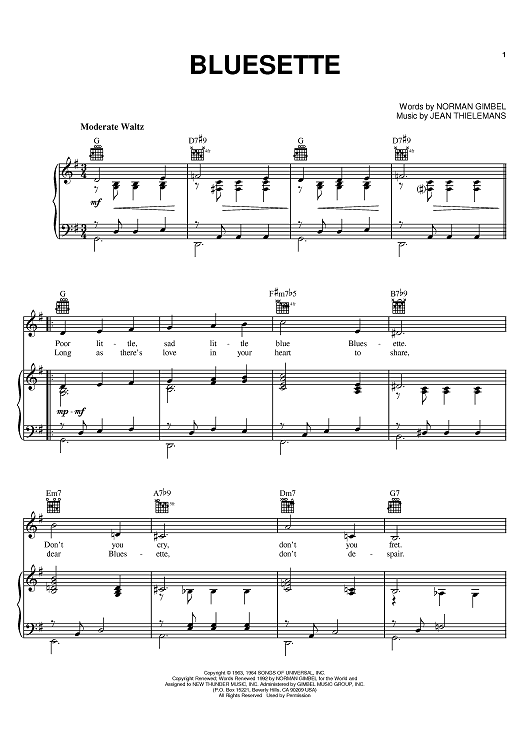 Digital Sheet Music for Bluesette by Norman Gimbel, Sarah Vaughan, Jean Thielemans, Toots Thielmans scored for Piano/Vocal/Chords; id:373291