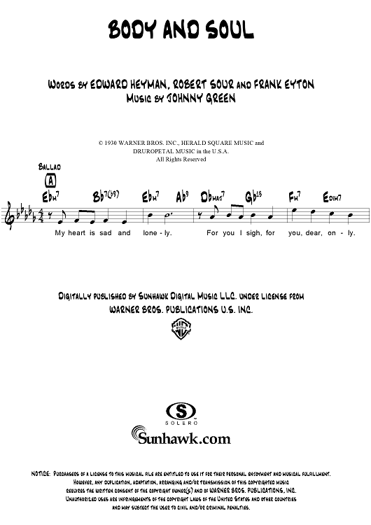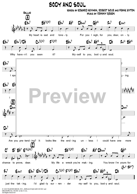 Digital Sheet Music for Body and Soul by Edward Heyman, Johnny Green, Frank Eyton, Robert Sour scored for Lead Sheet; id:307483