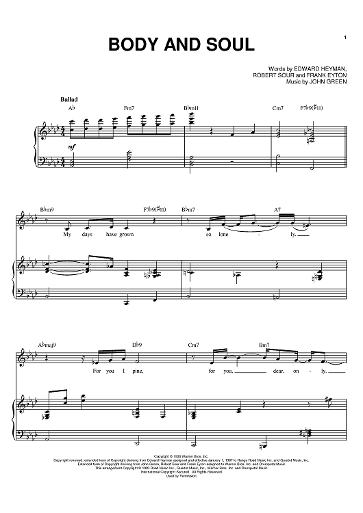 Digital Sheet Music for Body And Soul by Louis Armstrong, Nat King Cole, Billie Holiday, Art Tatum, Teddy Wilson, Sarah Vaughan, Ella Fitzgerald, Edward Heyman, Johnny Green, Frank Eyton, Robert Sour, Benny Goodman, Coleman Hawkins scored for Piano/Vocal/Chords; id:380437