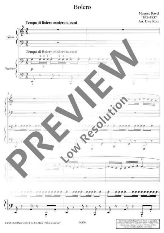 The Bolero is, without doubt, the most famous of all works by Maurice Ravel (1875-1937). Countless concert performances and recordings as well as its use in films and on television have made this beguiling piece immortal. With this edition, Schott now presents an arrangement for piano duet.