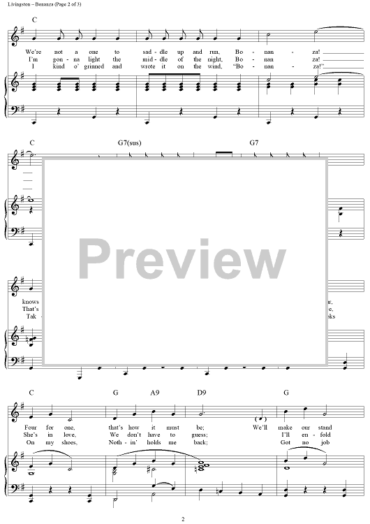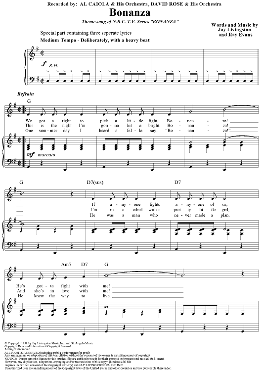 Digital Sheet Music for Bonanza by Jay Livingston, Ray Evans, Al Caiola and His Orchestra, Lorne Greene, David Rose scored for Piano/Vocal/Chords; id:110076
