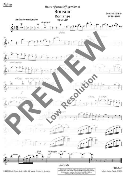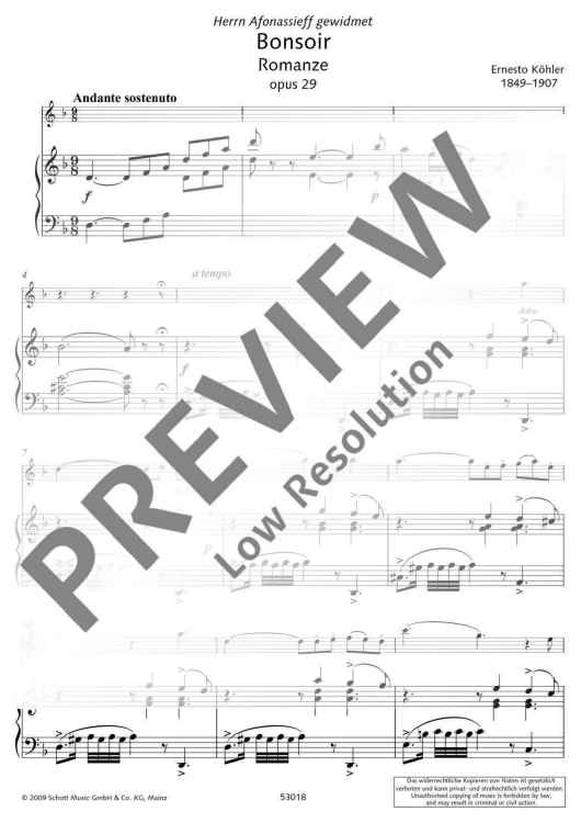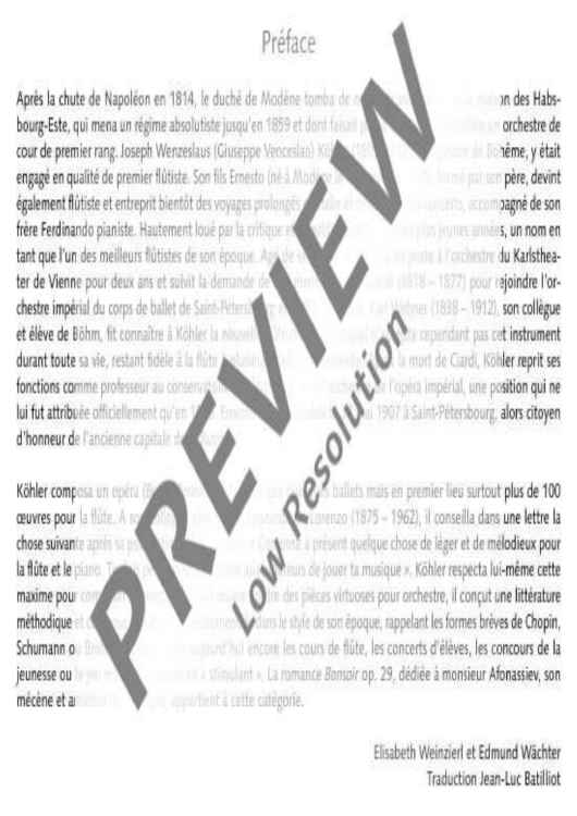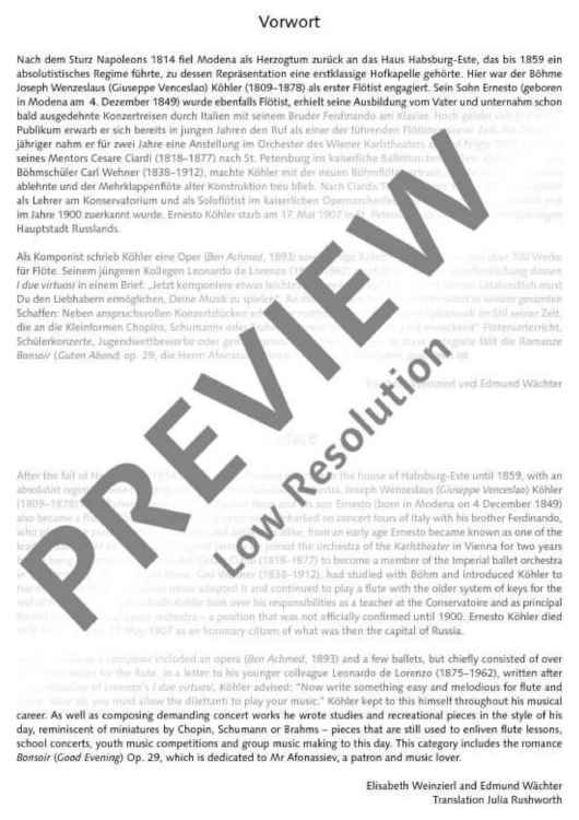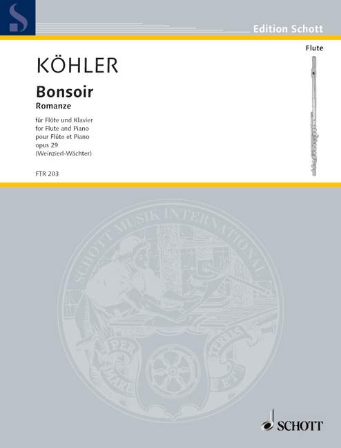 Apart from demanding concert pieces, Ernesto Köhler (1849-1907) primarily wrote methodological literature and music for playing in the Romantic style which are reminiscent of the small forms of Chopin, Schumann or Brahms and to this day form an inherent part of flute lessons, pupils' concerts and the competition 'Jugend musiziert'. Under this category come the romance Bon soir Op. 29 and Valse Espagnole Op. 57, two expressive character pieces for lessons and concerts.