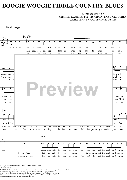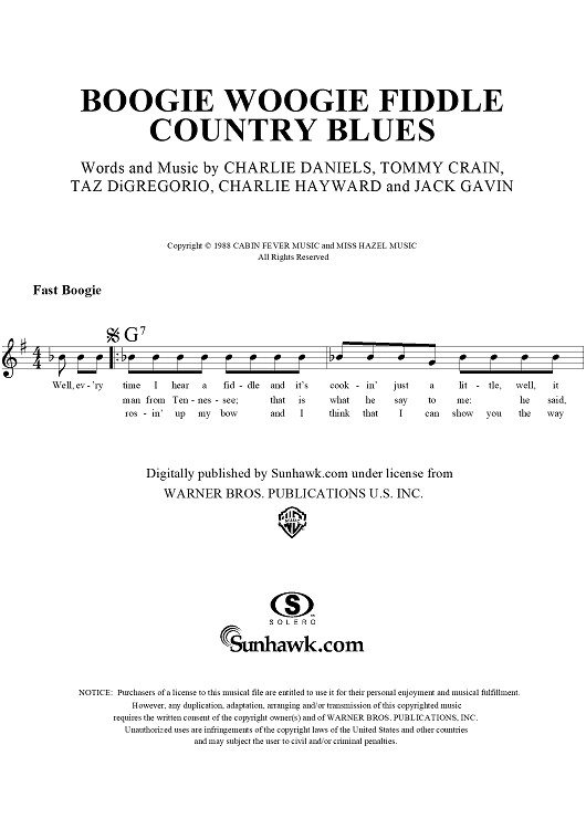 Digital Sheet Music for Boogie Woogie Fiddle Country Blues by Charlie Daniels, Tommy Crain, Taz DiGregorio, Charlie Heyward, Jack Gavin, Charlie Daniels Band scored for Lead Sheet; id:271871