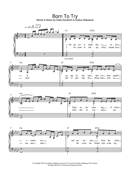 Digital Sheet Music for Born To Try by Delta Goodrem scored for Piano; id:378002