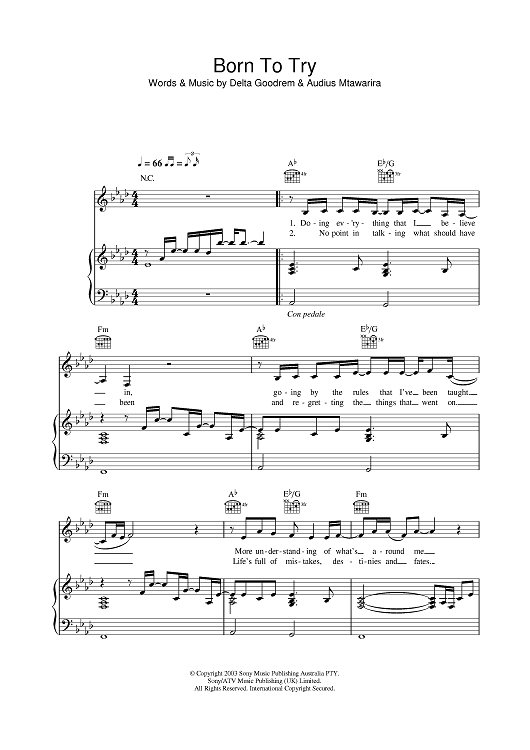 Digital Sheet Music for Born To Try by Delta Goodrem scored for Piano/Vocal/Chords; id:378003