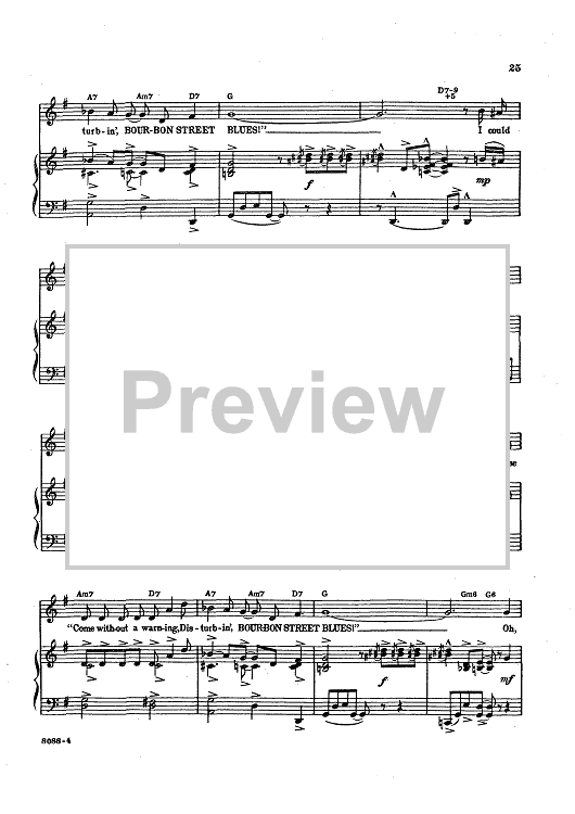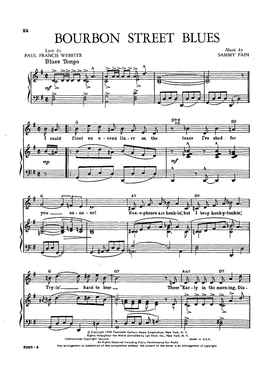 Digital Sheet Music for Bourbon Street Blues by Sammy Fain, Paul Francis Webster, Pat Boone, Gary Crosby, Tommy Sands scored for Piano/Vocal/Chords; id:423170
