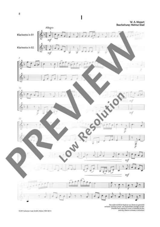 What would Mozart think of this Helmut Eisel’s klezmer-style arrangement of the well-known 12 Kegel-Duette [Bowling Duets] KWV 487 for two clarinets? With imaginative variations on the original melodies as well as plenty of room for improvisation. Tips for interpretation and improvisation included. BOWLING WITH MOZART - press reviews: "A great deal of thought has clearly gone into these duets. All of them involve some improvisation, and for anyone new to this it is worth reading the preface, which suggests some starting points. For those already familiar with the style, this could be an opportunity to show off!"- CLARINET & SAXOPHONE MAGAZINE