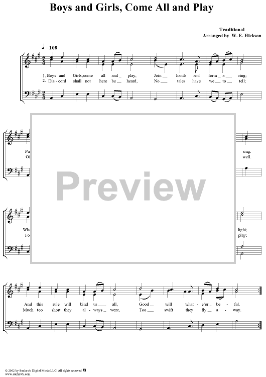 Digital Sheet Music for Boys and Girls, Come All and Play by William E. Hickson, Traditional scored for Three-part Mixed Chorus; id:260609