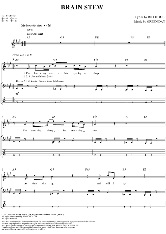 Digital Sheet Music for Brain Stew by Green Day, Billie Joe scored for Bass Tab/Vocal; id:357804