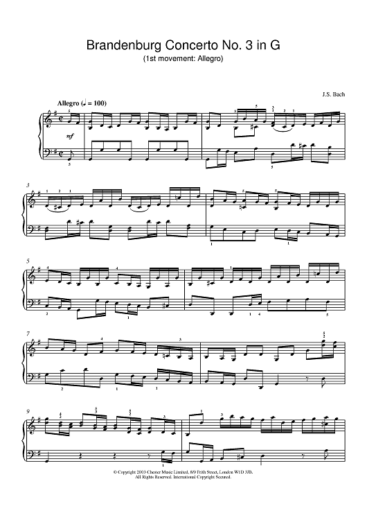 Digital Sheet Music for Brandenburg Concerto No. 3 in G (1st movement: Allegro) by Johann Sebastian Bach scored for Piano; id:378889