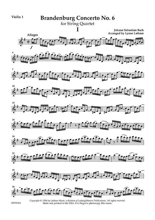 Digital Sheet Music for Brandenburg Concerto No. 6 - Violin 1 by Johann Sebastian Bach, Lynne Latham scored for String Quartet; id:460559