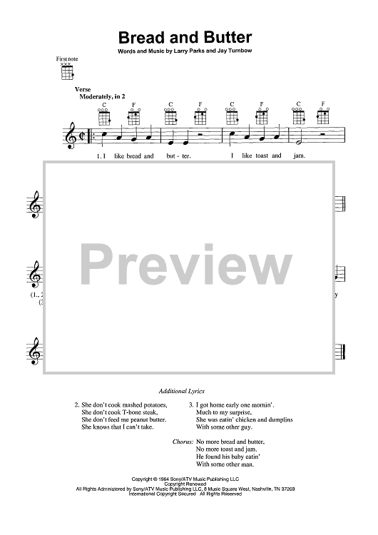 Digital Sheet Music for Bread and Butter by Jay Turnbow, Larry Parks, The Newbeats scored for Ukulele/Vocal; id:448972