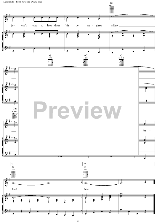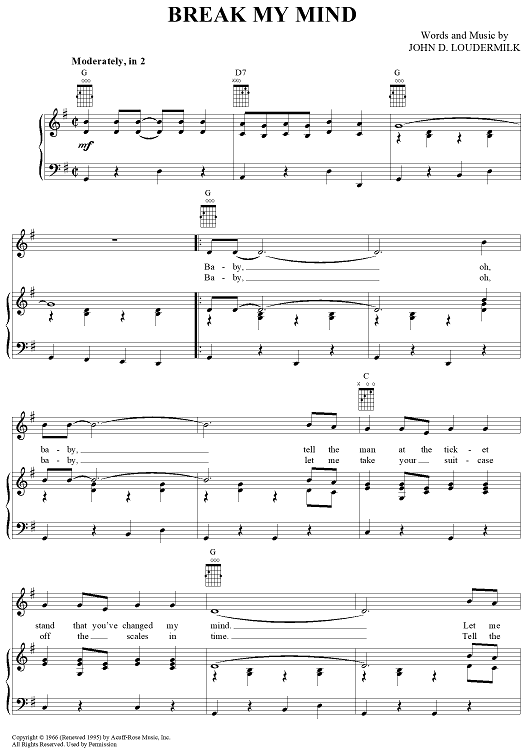 Digital Sheet Music for Break My Mind by John D. Loudermilk, George Hamilton IV scored for Piano/Vocal/Chords; id:367709