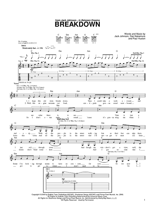 Digital Sheet Music for Breakdown by Paul Huston, Jack Johnson, Dan Nakamura scored for Guitar Tab; id:384985