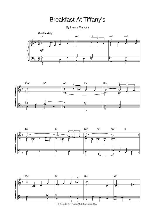 Digital Sheet Music for Breakfast At Tiffany's by Henry Mancini scored for Piano; id:380808