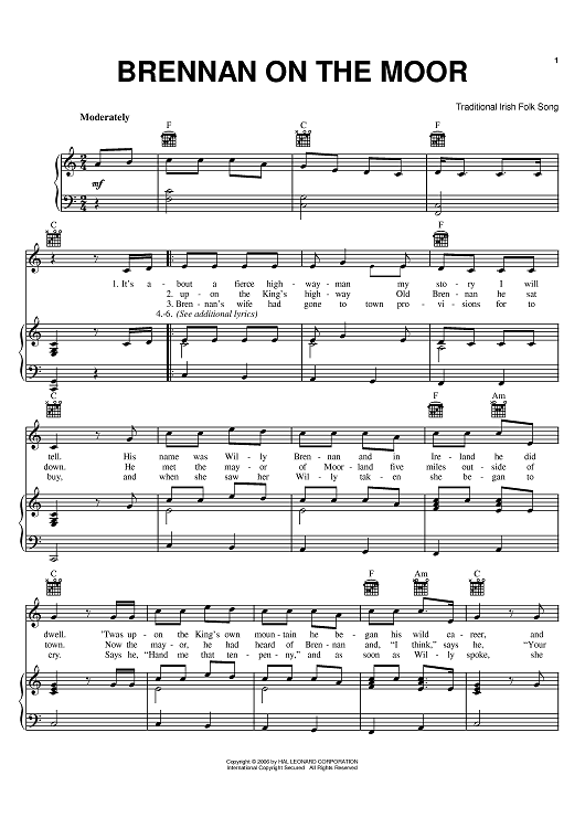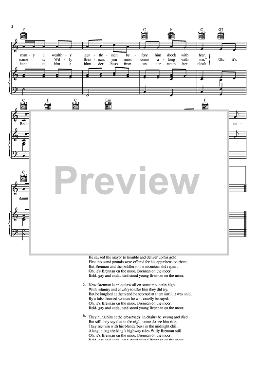 Digital Sheet Music for Brennan On The Moor by scored for Piano/Vocal/Chords; id:393921