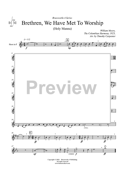 Digital Sheet Music for Brethren, We Have Met To Worship - Horn in F by William Moore, Timothy Carpenter scored for Brass Quintet; id:410427