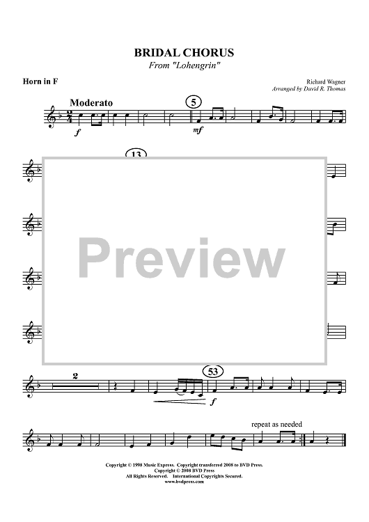 Digital Sheet Music for Bridal Chorus from "Lohengrin" - Horn by Richard Wagner, David R. Thomas scored for Brass Quintet; id:404816