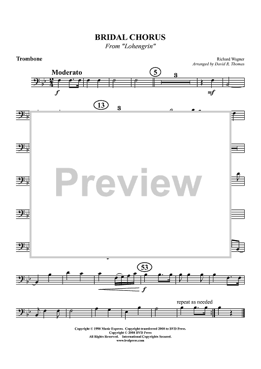 Digital Sheet Music for Bridal Chorus from "Lohengrin" - Trombone by Richard Wagner, David R. Thomas scored for Brass Quintet; id:404817