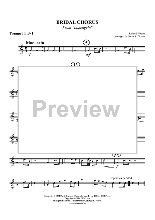 Digital Sheet Music for Bridal Chorus from "Lohengrin" - Trumpet 1 by Richard Wagner, David R. Thomas scored for Brass Quintet; id:404814