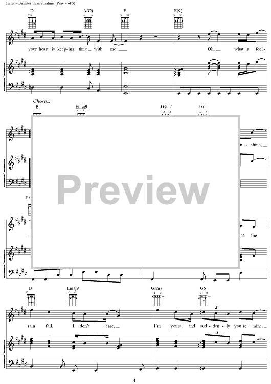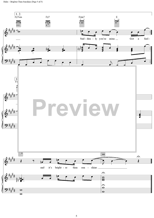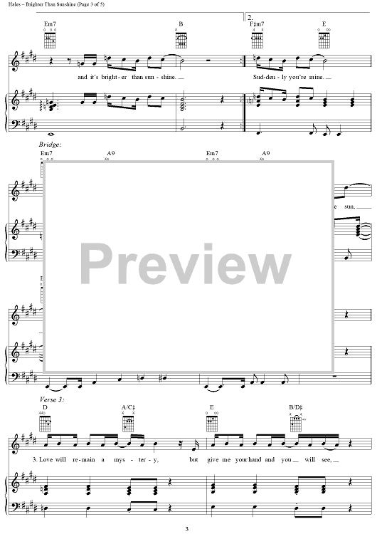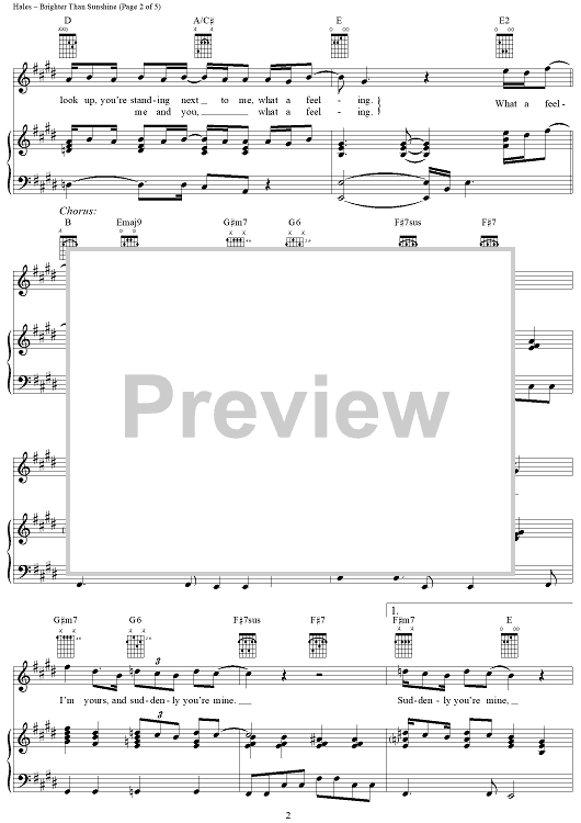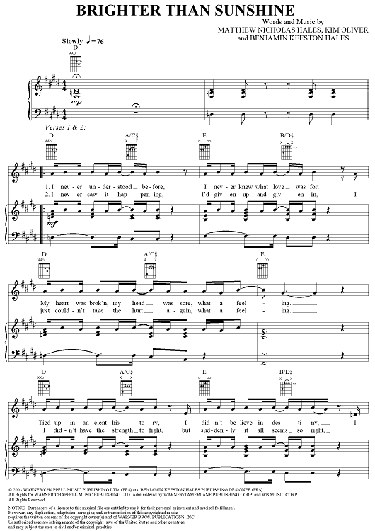 Digital Sheet Music for Brighter Than Sunshine by Matthew Nicholas Hales, Kim Oliver, Benjamin Keeston Hales, Aqualung scored for Piano/Vocal/Chords; id:314674
