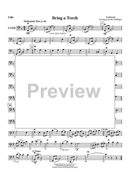 Digital Sheet Music for Bring A Torch - Cello by Traditional, Roy Phillippe scored for Orchestra; id:408024