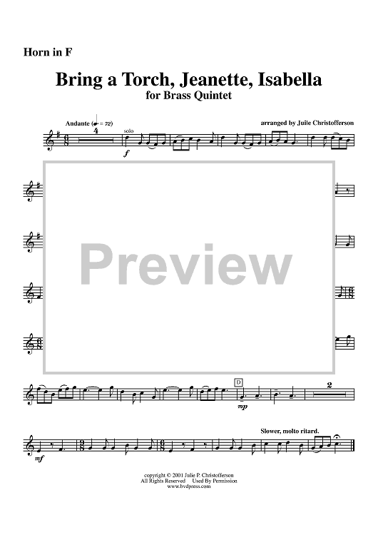 Digital Sheet Music for Bring a Torch, Jeanette, Isabella - Horn in F by Julie Christofferson scored for Brass Quintet; id:314055