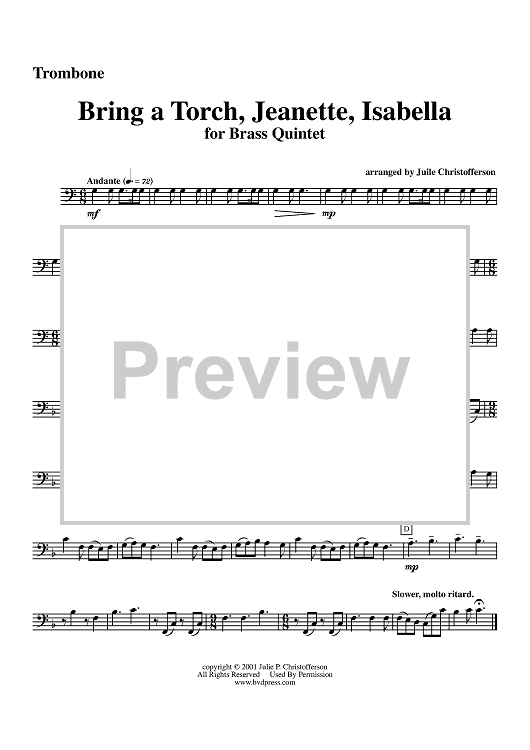 Digital Sheet Music for Bring a Torch, Jeanette, Isabella - Trombone by Julie Christofferson scored for Brass Quintet; id:314056