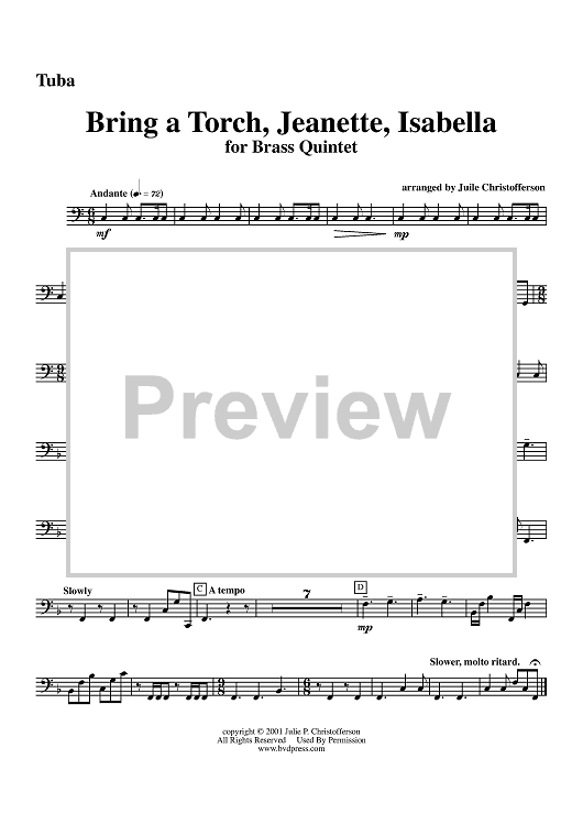 Digital Sheet Music for Bring a Torch, Jeanette, Isabella - Tuba by Julie Christofferson scored for Brass Quintet; id:314057