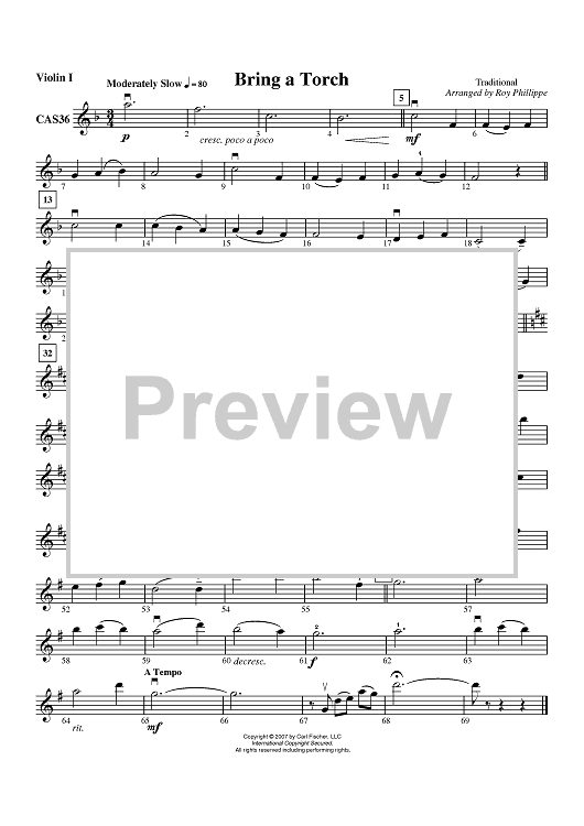 Digital Sheet Music for Bring A Torch - Violin 1 by Traditional, Roy Phillippe scored for Orchestra; id:408020