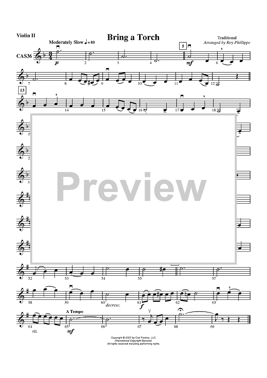 Digital Sheet Music for Bring A Torch - Violin 2 by Traditional, Roy Phillippe scored for Orchestra; id:408021