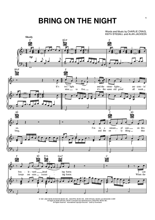 Digital Sheet Music for Bring On The Night by Charlie Craig, Keith Stegall, Al Jackson Jr scored for Piano/Vocal/Chords; id:367855