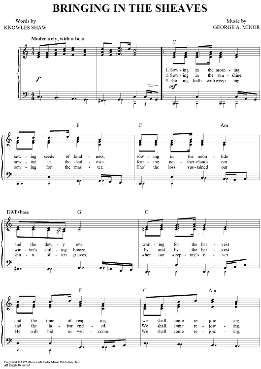 Digital Sheet Music for Bringing In The Sheaves by Knowles Shaw, George A. Minor scored for Easy Piano/Vocal/Chords; id:432748