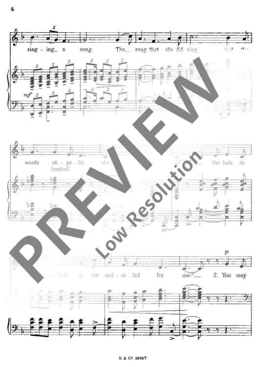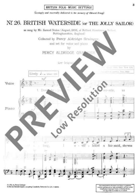 British Waterside (or The Jolly Sailor) as sung by Mr Samuel Stokes (August, 1906, at Retford Almshouses, Retford, Nottinghamshire, England). Collected by Percy Aldridge Grainger and set for voice and piano by Percy Aldridge Grainger.Low (original) key version, range = C-C (one octave), maybe sung at any octave.