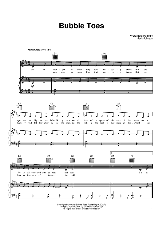 Digital Sheet Music for Bubble Toes by Jack Johnson scored for Piano/Vocal/Chords; id:389771