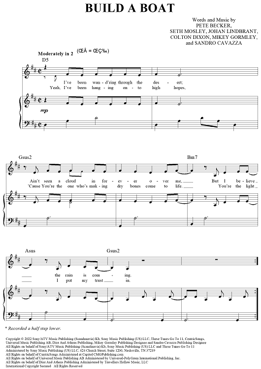Digital Sheet Music for Build A Boat by Colton Dixon, Pete Becker, Seth Mosley, Johan Lindbrant, Mikey Gormley, Sandro Cavazza scored for Piano/Vocal/Chords; id:498156