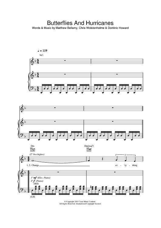Digital Sheet Music for Butterflies And Hurricanes by Matthew Bellamy, Dominic Howard, Muse, Chris Wolstenholme scored for Piano/Vocal/Chords; id:384525